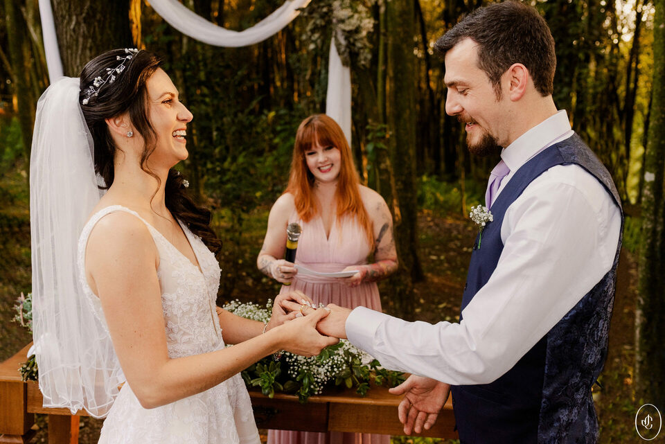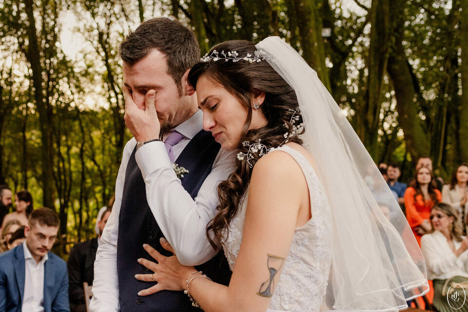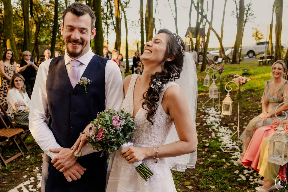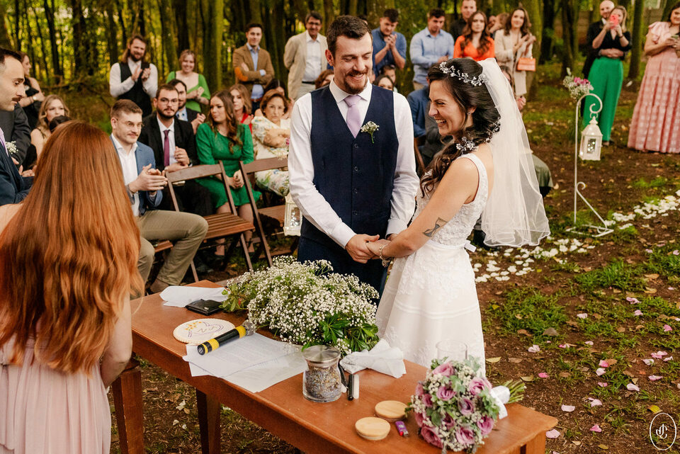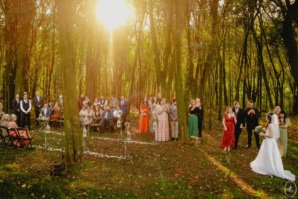 A Jacque e o Nelson realizaram sua cerimônia de casamento em um fim de tarde lindo em meio às árvores, no Clube Ponta Lagoa, na cidade de Ponta Grossa-PR.